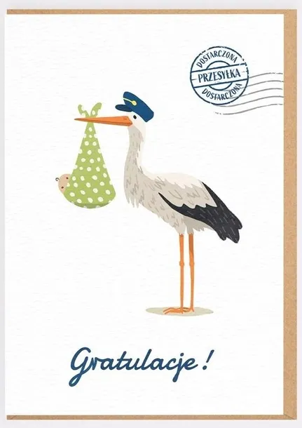 Bocian biały jest zwiastunem dobrej nowiny - oto przesyłka została dostarczona! W dodatku nie byle jaka, bo od tej pory już nic nie będzie takie samo. Ten berbeć wprowadzi nowy ład i zmieni wszystko! Kartka GRATULACJE poleca się jako dodatek do prezentu z okazji narodzin dziecka. Kartka w zestawie z elegancką kopertą jest pusta w środku i została wydrukowana na papierze ekologicznym. Jej wnętrze czeka na wypełnienie treścią płynącą prosto z Twojego serca!