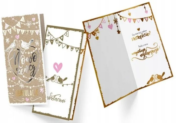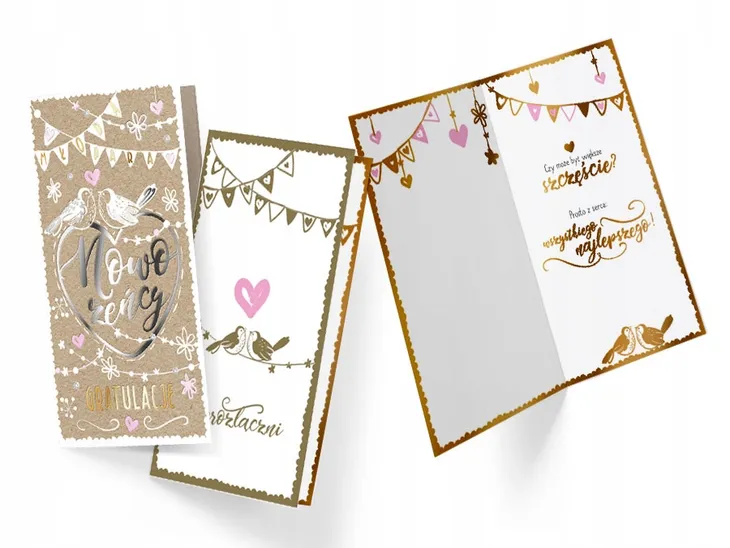✔️ Karnet Passion Moments - bogato zdobiony karnet, w zależności od wzoru posiada dekoracje ze złotej, srebrnej, perłowej lub holograficznej folii, a także doklejki biżuteryjne, kokardki, brokat, laserowe wycięcia, wstążeczki i inne dodatki. Wnętrze karnetu do zawsze atrakcyjna grafika i tekst życzeń. Kartki mają w komplecie dopasowaną kopertę. Wymiary karnetu po złożeniu: 11,4 x 21,5 cm.