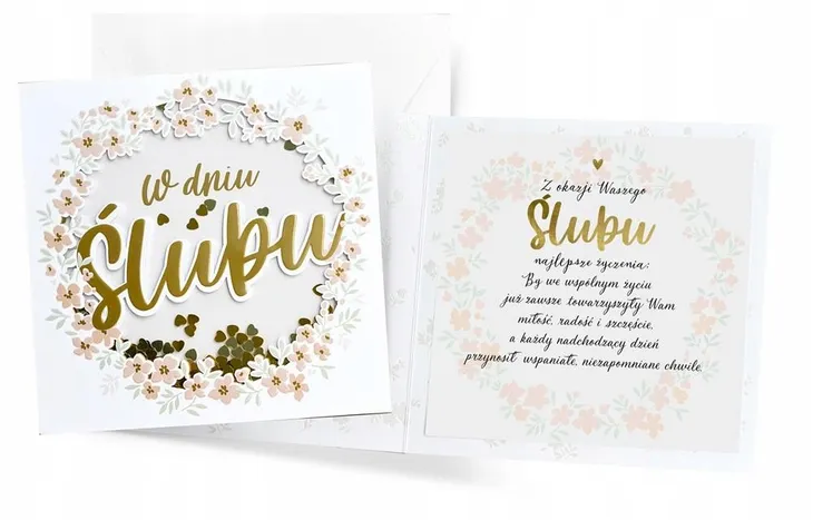 W środku każdej kartki znajdują się dobrane do okazji życzenia, a do kartki dołączona jest dopasowana koperta.