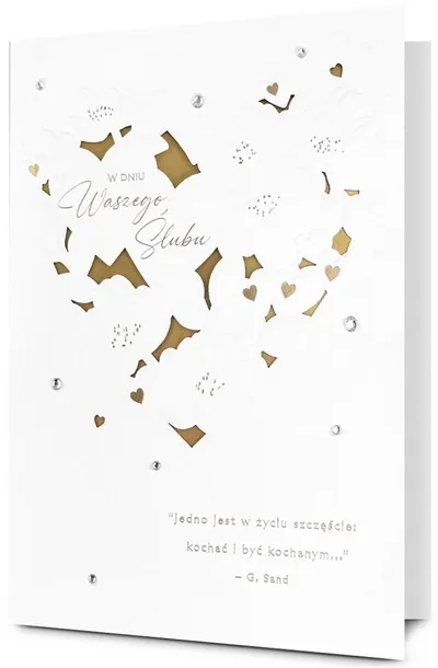 Kartka jest bogato i różnorodnie zdobiona (zależnie od wzoru: metaliczna folia, lakier perłowy,