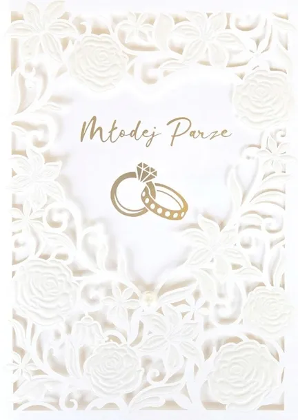 Elegancki karnet na Ślubny w formacie B6 z laserowo wycinanym wzorem. Delikatny, ażurowy motyw z symbolami ślubnymi. Wewnątrz miejsce na życzenia. Idealna pamiątka tego ważnego dnia.