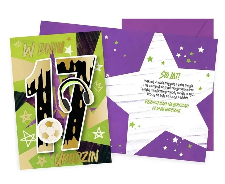 Kartka Dream Cards "W dniu 17 urodzin" DK-1271 Kartka B6 z ozdobnej serii Dream Cards - nieduża, ale robi wrażenie dzięki atrakcyjnej kolorystyce i ciekawym zdobieniom. To idealny wybór łączący przyjazną cenę z jakością. Cechy szczególne: wielkość: B6, 16.6 x 11.7 cm po złożeniu, koperta: w zestawie, kolorowa, zdobienia: kolorowe, różnorodne, bogate (w zależności od wzoru: przyklejane dekoracje, elementy biżuteryjne, odstawniki, metaliczne folie, tłoczenia itp.), okazja: urodziny