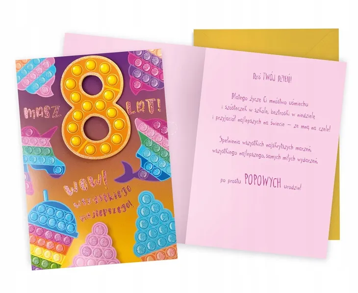 Karnet okolicznościowy z kopertą i życzeniami w środku.