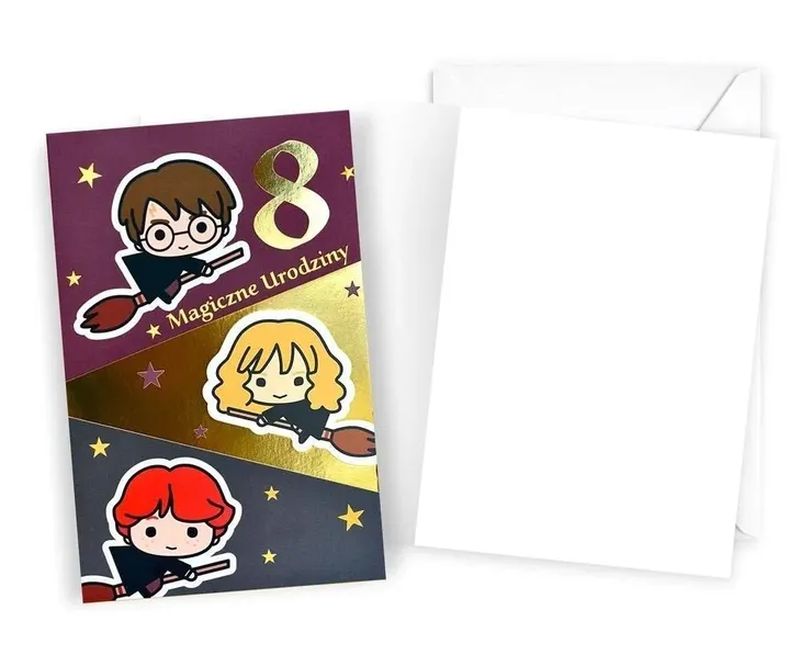 Kartka z wyjątkowymi życzeniami w środku, zdobiona metaliczną folią, kolorowa w środku i na zewnątrz, z białą kopertą w zestawie.