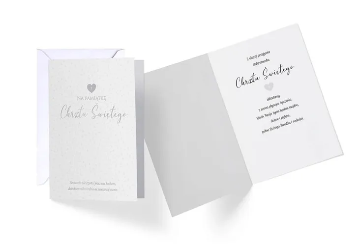 Karnet Vision w powiększonym tzw. Angielskim formacie 140x190 mm. Wykonane z niezwykłą dbałością o szczegóły, zdobione folią holograficzną i w całości pokryte folią matową dla podkreślenia efektu prostoty i elegancji. Wewnątrz znajduje się tekst życzeń, a całość uzupełnia dedykowana srebrna koperta.