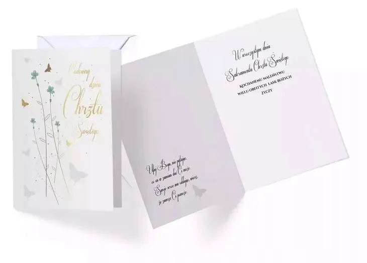 Karnet Vision "Chrzest" w powiększonym tzw. Angielskim formacie 140x190 mm. Wykonane z niezwykłą dbałością o szczegóły, zdobione folią holograficzną i w całości pokryte folią matową dla podkreślenia efektu prostoty i elegancji. Wewnątrz znajduje się tekst życzeń, a całość uzupełnia dedykowana biała koperta.