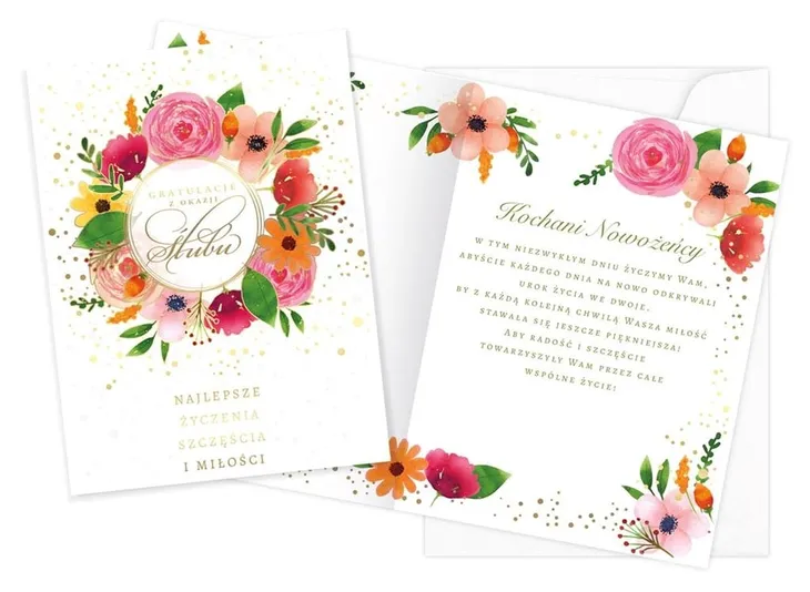 W powiększonym tzw. Angielskim formacie 140x190 mm. Wykonana z niezwykłą dbałością o szczegóły, zdobiona złotą, matową folią oraz lakierem UV dla podkreślenia wyjątkowości i elegancji. Wewnątrz znajduje się tekst życzeń, a całość uzupełnia dedykowana biała koperta. okazja: Ślub