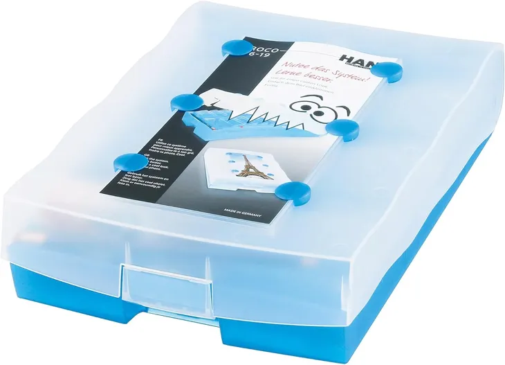 System uczenia się CROCO wszystko jest w zestawie: 19 pudełek, szczegółowa instrukcja obsługi (może nie być dostępna w języku polskim), ołówek z gumką, etykietką do opisania i 100 kolorowych fiszek. Po otwarciu stabilna pokrywa znika pod pudełkiem, po zamknięciu karty są zabezpieczone przed wyślizgnięciem.
