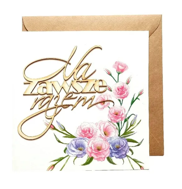 Kartka okolicznościowa z okazji Ślubu o treści: Bądźcie dla siebie i ziarnem pieprzu, i szczyptą soli, i tym, co cieszy, i tym, co boli. Trwajcie razem, gdy miłość w rozkwicie i gdy ku jesieni swe kroki skieruje życie.