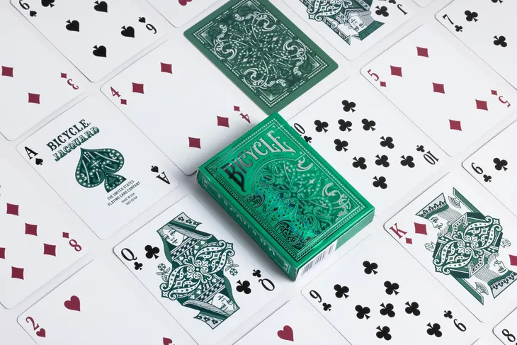 „Bicycle Jacquard” czerpie inspirację ze złożonych, ozdobnych wzorów często wplecionych w tkaninę, co daje piękne efekty. Etui „Bicycle Jacquard” ma wplecione detale z szmaragdowozielonej i srebrnej folii, tworząc olśniewający i dramatyczny wygląd. Tak jak maszyny żakardowe zrewolucjonizowały Looms dzięki działaniu „łańcucha kart”, tak ta wysokiej jakości talia kart została zaprojektowana i wyprodukowana przy użyciu tej samej wyrafinowanej i innowacyjnej technologii.