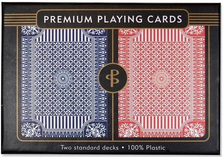 Zestaw tradycyjnych kart marki Peter Pauper Press. Zawiera po 2 talie 52 kart oraz dodatkowo po 2 szt kart Joker - standardowe talie wykorzystywane w wielu grach. Symbole figur i kolorów mają duże i czytelne oznaczenia. Karty wykonano z plastiku, dzięki czemu łatwo się tasują, są niezwykle trwałe i nie łamią się. Posiadają elegancki, klasyczny nadruk i są pakowane w trwałe pudełko - idealne jako pomysł na prezent.