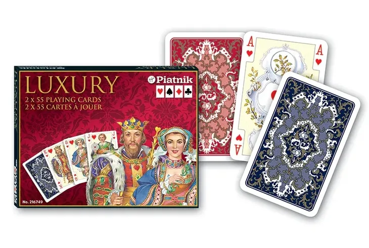 Luxury' to prawdziwa esencja kart, sztandarowy wzór Piatnika, znany w Polsce od przedwojennych lat. W komplecie 2 wyjątkowe talie, nieco większe od standardowych, w eleganckim, złoconym pudełku z charakterystyczną Piatnikowską poduszeczką. Na awersach jedyne w swoim rodzaju Piatnikowskie figury. Rewersy nie tylko szlachetne, ale także symetryczne i wyraźnie różniące się od siebie. Talie składają się z 55 plastikowanych kart o gramaturze 310 i wymiarach 62 x 91 mm.Wiek: +3