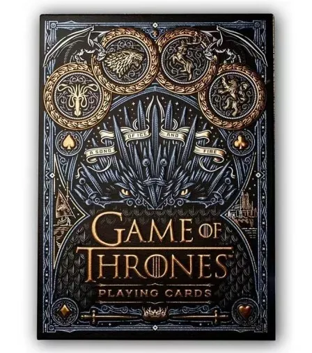 Karty do gry premium inspirowane legendarnym serialem telewizyjnym HBO Gra o tron.Bogate połączenie detali z brązu, złota, lodowego błękitu i folii żelaznej, wraz z wytłoczeniami o najwyższej jakości teksturze, sprawia wrażenie, jakby każdy pokład śpiewał pieśń lodu i ognia. Wybierz się w podróż po Westeros i Siedmiu Królestwach!