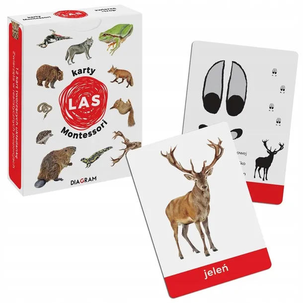 Karty Montessori. LAS to okazja do poznawania zwierząt zamieszkujących polskie lasy i zabawy w rozpoznawanie ich tropów. W kieszonkowym formacie (klasyczne karty do gry) znajdziesz 40 kart typu memory: zwierzę + trop oraz 12 kart tworzących układankę, na której zwierzęta są przedstawione w realistycznych proporcjach. Rozróżnienie niektórych tropów jest wyjątkowo trudne, więc dla ułatwienia w rogu znajdują się podpowiedzi w postaci cieni zwierząt. Karty Montessori. LAS pozwalają na kreatywną zabawę z dziećmi w różnym wieku. Maluchy będą chętnie poznawać mieszkańców lasu oraz ich odgłosy, a starszaki będą odkrywać szczegóły różniące tropy poszczególnych gatunków.