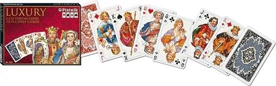 Najwyższej jakości karty do gry renomowanej firmy Ferd. Piatnik & Sohne. "Luxury" to prawdziwa esencja kart, sztandarowy wzór Piatnika, znany w Polsce od przedwojennych lat. W komplecie 2 wyjątkowe talie. Na awersach jedyne w swoim rodzaju Piatnikowskie figury. Rewersy nie tylko szlachetne, ale także symetryczne i wyraźnie różniące się od siebie. Właśnie dlatego to doskonałe karty dla wszystkich, od początkujących po wytrawnych graczy. Talie składają się z 55 plastikowanych kart o gramaturze 310 i wymiarach 58 x 89 mm. Idealne zarówno do brydża, pokera, remika jak i innych gier. Wyroby wiedeńskiej fabryki Ferd. Piatnik & Sohne od 1824 roku urzekają bogactwem wzorów i perfekcją wykonania. Jakość i tradycja!n