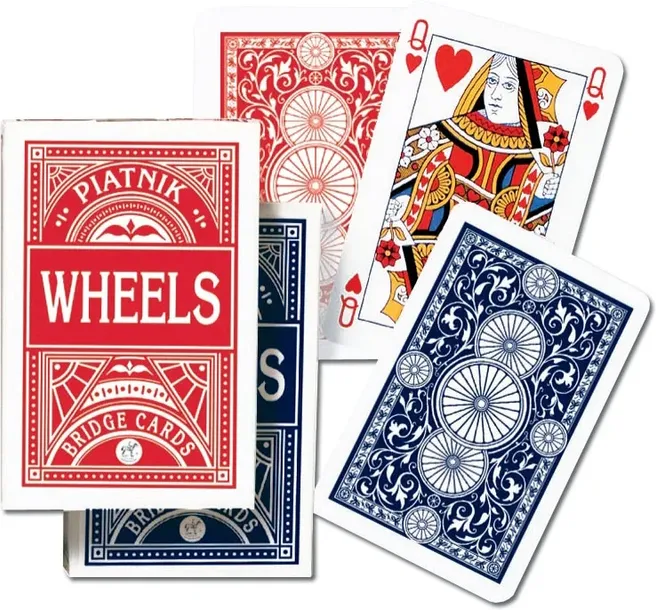Klasyczne, wysokiej jakości karty do gry renomowanej firmy Ferd. Piatnik & Sohne. "Wheels" - najtańsze w swojej klasie. Talia składa się z 55 plastikowanych kart o wymiarach 58 x 89 mm i gramaturze 310. Idealna zarówno do brydża, pokera, remika jak i innych gier. Wyroby wiedeńskiej fabryki Ferd. Piatnik & Sohne od 1824 roku urzekają bogactwem wzorów i perfekcją wykonania. Jakość i tradycja!n