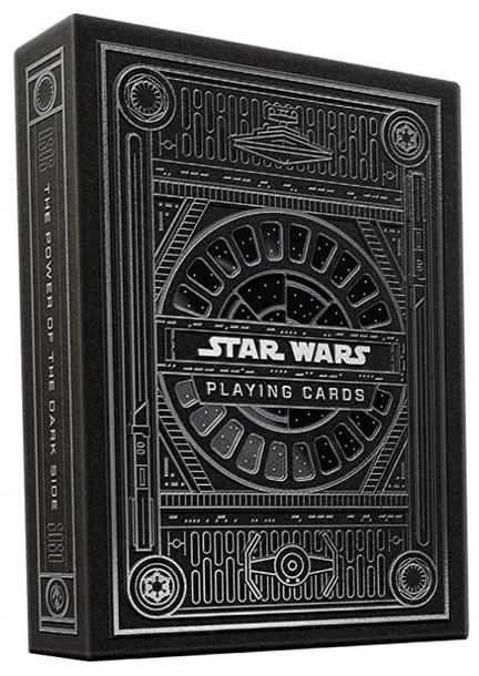 Srebrna edycja specjalna STAR WARS The Dark temu w odległej galaktyce...Karty dworskie Ciemnej Strony to postacie Palpatine, Kylo Rena, Dartha Vadera i innych. Darth Vader jako król pik trzyma miecz świetlny i przejmując dowództwo nad swoimi imperialnymi podwładnymi zwraca się do nas: Martwi mnie twój brak tylko karty są spektakularne - zachwyca również opakowanie, czarne jak szata Lorda Vadera, z wytłoczeniami, z akcentami folii w srebrnym kolorze: z przodu pudełka widzimy okno Imperialnej Sali Tronowej, z symbolami Imperium Galaktycznego i Najwyższego Porządku na każdym : poker, tradycyjne gry karciane, wróżenie, pasjans, iluzja karciana, ść kart: 54, w tym dwa jokery.