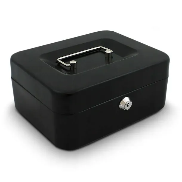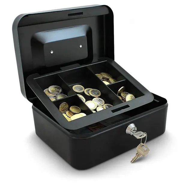 Fabrycznie nowa, wysokiej jakości metalowa kasetka do przechowywania lub transportu monet, banknotów lub innych wartościowych przedmiotów.Solidna i poręczna walizka z metalu wyposażona w sortownik do monet jest idealnym miejscem do przechowywania banknotów oraz monet. Na dole jest sporo miejsca na przykład na rachunki, paragony, monety, banknoty i inne przydatne przedmioty. Dla bezpieczeństwa kasetka jest zamykana na klucz. Ergonomiczny uchwyt sprawia że transport staje się dziecinnie prosty.