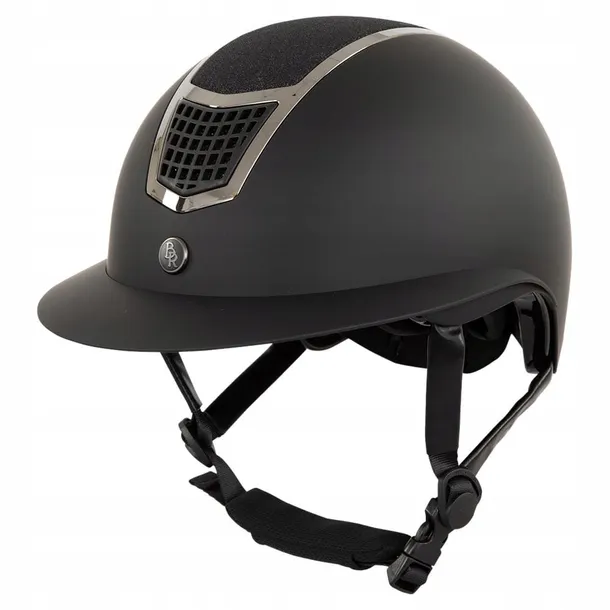 Kask jeździecki BR Lambda Plus wyróżnia się eleganckim wyglądem z efektowną brokatową wstawką, kratką wentylacyjną i dużym daszkiem. Kask posiada lekką skorupę z mocnego materiału ABS. Góra kasku pokryta jest brokatowym materiałem oraz ozdobiona błyszczącą obwódką i otworami wentylacyjnymi, które zapewniają przyjemny efekt chłodzenia podczas jazdy. Pasek pod brodę został osłonięty miękkim materiałem Cooldry. Wewnętrzna wkładka wykonana jest z Cooldry® i siateczki, która szybko schnie i utrzymuje przyjemne uczucie chłodu. Jest całkowicie zdejmowana i można ją prać w pralce w temperaturze 40°C.
