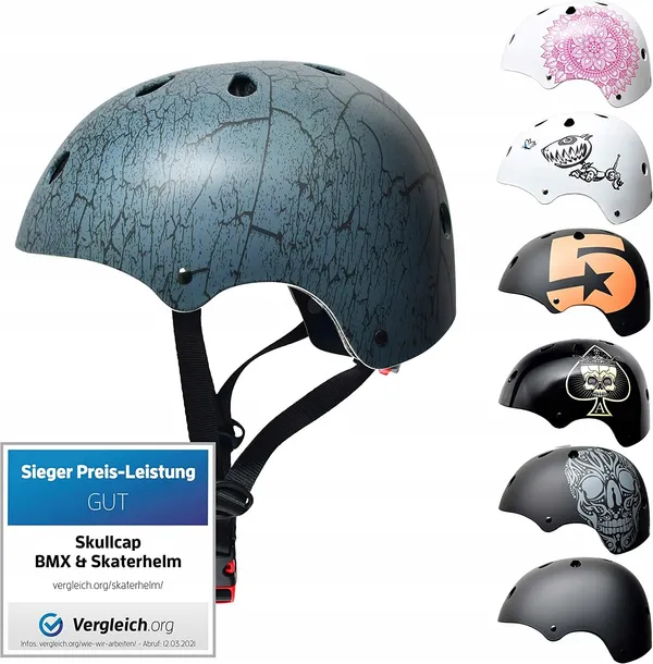 Marka Skullcap Rozmiar 53 - 55 cm Materiał zewnętrzny Poliwęglan (PC) Zalecane zastosowania produktu Rower Deskorolka. Wymiary produktu dł. x szer. x wys. 28 x 20 x 20 centymetrów. Materiał wewnętrzny spieniony Polistyren .Waga przedmiotu 330 gramów. Styl dowolny.