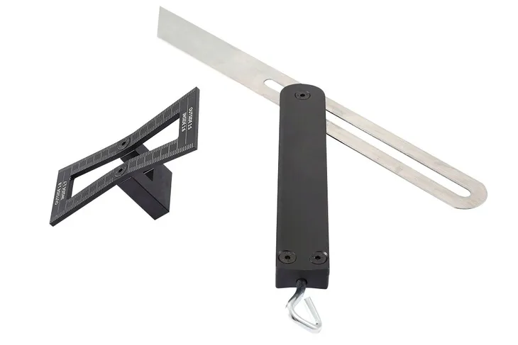 Kątownik regulowany, ostrze ze stali nierdzewnej, uchwyt i jaskółczy ogon z aluminium, blokada stalową nakrętką motylkową umieszczoną w stalowym gwincie, możliwość ustawienia dowolnego kąta, dodatkowo dołączony jaskółczy ogon do kreślenia połączeń drewna, skala: 1:5, 1:6, 1:7, 1:8