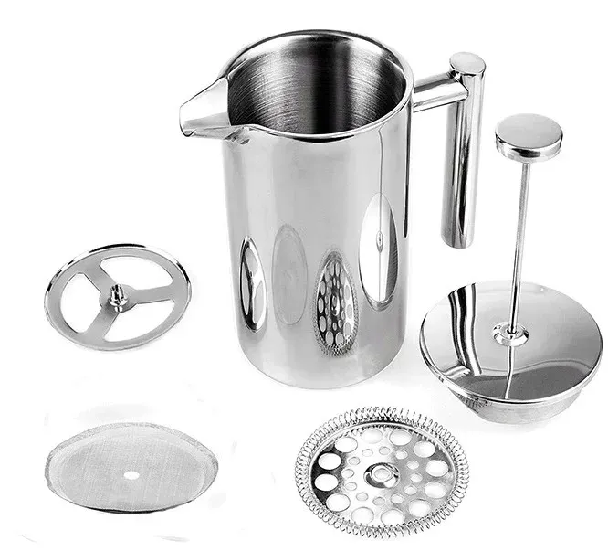 Dwuścienna prasa francuska wykonana jest w całości ze stali nierdzewnej 18/10. Produkt posiada nienagrzewający się uchwyt, szczelnie przylegającą pokrywkę oraz zgrabny dzióbek do nalewania.
