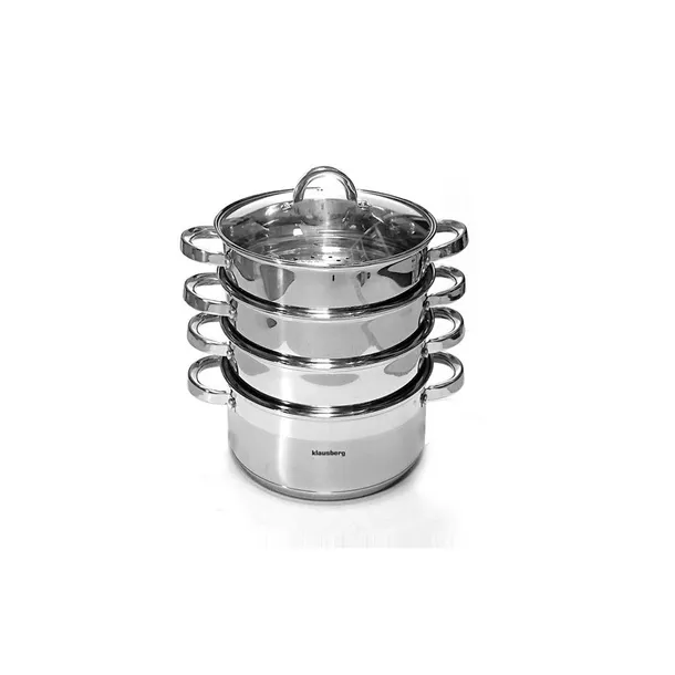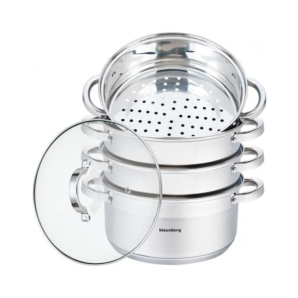 5 częściowy komplet garnków do gotowania na parze KLAUSBERG bazujący na garnku 5.0L / Ø24cm. Zestaw wykonany z wysokiej jakości stali nierdzewnej. Wykorzystana stal składa się z najlepszej jakości stopu powszechnie stosowanego w światowej klasy produktach, co gwarantuje jej wysoką odporność na korozję oraz bardzo dobrą wytrzymałość. Zastosowany materiał umożliwia szybkie podgrzanie potraw i przez dłuższy czas utrzymuje ciepło. Produkt przystosowany do gotowania na kuchenkach indukcyjnych, gazowych, elektrycznych, ceramicznych i halogenowych.