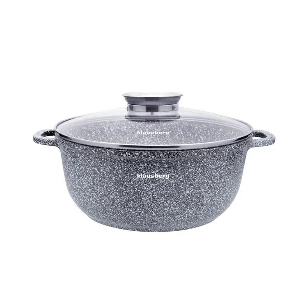 Garnek KLAUSBERG pokryty ceramiczną marmurową powłoką nieprzywierającą. Wyposażony w pokrywkę szklaneą z uchwytem Aroma Knob w którym umieszczono dozownik oleju, dzięki któremu podczas gotowania lub duszenia można podawać olej lub płynne przyprawy. Garnki z tej serii wykonane ze stopu aluminium posiadają indukcyjne ferromagnetyczne dno. Są przystosowane do współpracy z każdym rodzajem kuchni, włącznie z indukcyjną.