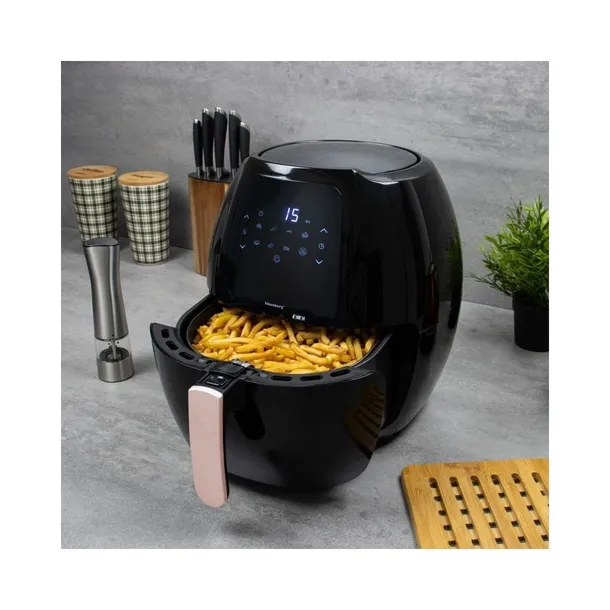Frytownica beztłuszczowa to wielofunkcyjne, kompaktowe urządzenie umożliwiające pieczenie, smażenie, podgrzewanie, grillowanie i rozmrażanie. Frytkownica korzysta z unikalnej technologii cyrkulacji gorącego powietrza, dzięki czemu do przygotowywania potraw nie jest potrzebny olej. Wykorzystuje ciąg wirującego gorącego powietrza, które zapewnia najpierw równomierne przygrzanie potrawy, a następnie jej opieczenie - aż do momentu uzyskania pożądanego efektu w postaci np. chrupiącej skórki kurczaka. Można w nim podgrzewać, piec, smażyć i grillować, jest więc uniwersalnym urządzeniem kuchennym pomagającym w codziennym przyrządzaniu zdrowych i dietetycznych posiłków. Obudowa urządzenia wykonana została z wytrzymałego tworzywa sztucznego w eleganckim czarnym kolorze. Frytkownicę wyposażono w pokryty powłoką nieprzywierającą wkład do smażenia umożliwiające przygotowanie różnorodnych potraw. W urzadzeniu można przygotować całego kurczaka. Misę można myć w zmywarce. Na panelu sterowania umieszczono pokrętło regulacji temperatury w zakresie od 80 do 200 °C oraz pokrętło timera umożliwiające ustawienie czasu pracy w zakresie od 0 do 60 min. Element grzewczy o mocy 1800W pozwala szybko osiągnąć wymaganą temperaturę, a termostat utrzyma ją na zadanym poziomie.