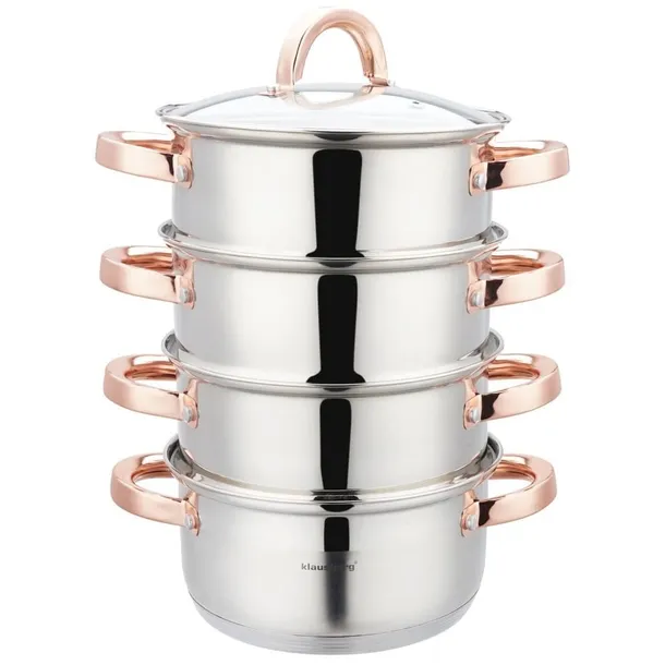 5 częściowy komplet garnków do gotowania na parze KLAUSBERG bazujący na garnku 2.5L / Ø18cm. Zestaw wykonany z wysokiej jakości stali nierdzewnej. Wykorzystana stal składa się z najlepszej jakości stopu powszechnie stosowanego w światowej klasy produktach, co gwarantuje jej wysoką odporność na korozję oraz bardzo dobrą wytrzymałość. Zastosowany materiał umożliwia szybkie podgrzanie potraw i przez dłuższy czas utrzymuje ciepło. Produkt przystosowany do gotowania na kuchenkach indukcyjnych, gazowych, elektrycznych, ceramicznych i halogenowych.
