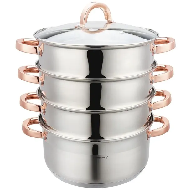 5 częściowy komplet garnków do gotowania na parze KLAUSBERG bazujący na garnku 5.0L / Ø24cm. Zestaw wykonany z wysokiej jakości stali nierdzewnej. Wykorzystana stal składa się z najlepszej jakości stopu powszechnie stosowanego w światowej klasy produktach, co gwarantuje jej wysoką odporność na korozję oraz bardzo dobrą wytrzymałość. Zastosowany materiał umożliwia szybkie podgrzanie potraw i przez dłuższy czas utrzymuje ciepło. Produkt przystosowany do gotowania na kuchenkach indukcyjnych, gazowych, elektrycznych, ceramicznych i halogenowych.