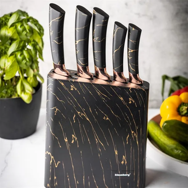 Marmurkowy wzór na rękojeściach i stojaku w połączeniu z czarnymi ostrzami i dekorami w odcieniu różowego złota dodatkowo podkreślają wyjątkowe wykończenie kompletu noży.