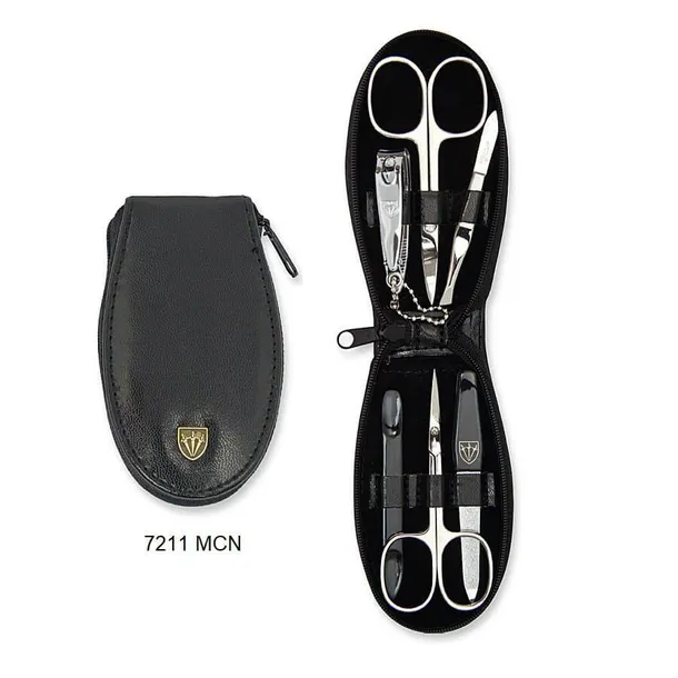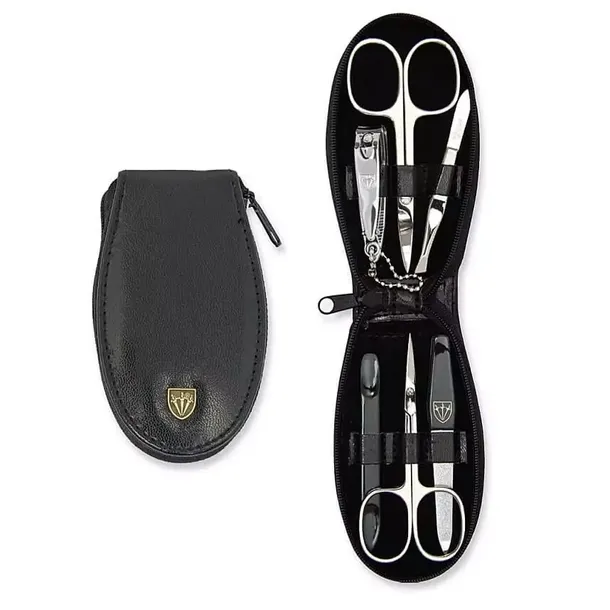 - Narzędzia wykonane z niemieckiej jakości stali nierdzewnej zostały włożone do etui w kształcie elipsy. Futerał na zewnątrz pokrywa czarna, matowa ekoskóra.