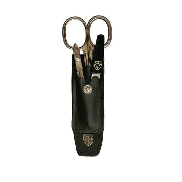 Mini zestaw do manicure L50002 MCN podstawowy zestaw narzędzi, który przyda się w każdej damskiej torebce lub podczas dalekiej wyprawy, gdy liczy się każdy centymetr miejsca w torbie podróżnej. Czarne, skórzane, zamykane na zatrzask etui ma wymiary: 3x10 cm. Dzięki takiemu opakowaniu bezpiecznie przewieziesz narzędzia, bez obawy o poczęcie lub uszkodzenie materiału wyścielający torbę czy walizkę. Zatrzask jest w kształcie tarczy z trzema mieczami, czyli odwzorowuje logo producenta.Wewnątrz znajdują się 3 najbardziej potrzebne narzędzia, czyli nożyczki o spiczastym zakończeniu, pęseta skośna, pilniczek. Dzięki czemu zadbasz o wygląd swoich paznokci w praktycznie każdym miejscu na ziemi, usuniesz zbędny włosek, czy w końcu odetniesz kawałek plasterka, jeśli się skaleczysz.Zestaw ten zrobiony został z nierdzewnej stali, poddanej niklowaniu. Litery "MC" oznaczają, że narzędzia są wyprodukowanej z dobrej jakości stali, dostępnej w całej ofercie niemieckiej firmy Kellermann.Natomiast litera "L" mówi nam o tym, że etui zostało zrobione ze skóry naturalnej.