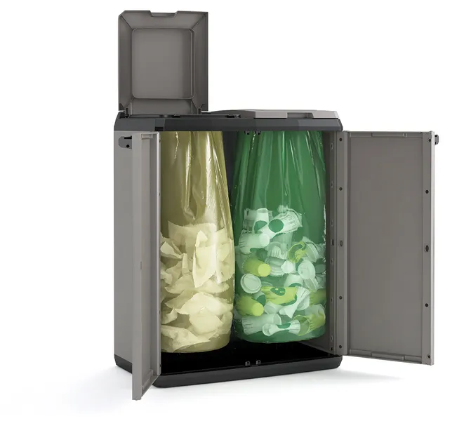 Szafka KIS SPLIT Basic łączy solidność, funkcjonalność i estetykę. Idealnie sprawdzi się do segregowania odpadów w domu, w garażu, na tarasie lub w pomieszczeniach gospodarczych. Dzięki niej worki na śmieci będą zawsze na swoim miejscu, a przestrzeń wokół pozostanie schludna i uporządkowana.