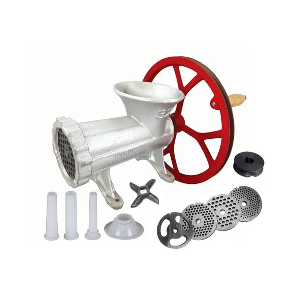 Profesjonalna maszynka żeliwna do mielenia mięsa #32 firmy KINGHOFF. Wymaga mocowania na stałe do blatu. Wykonana w całości żeliwna (odlew).Ta wersja maszynki przystosowana jest zarówno pod silnik elektryczny jak i do napędu ręcznego. Najważniejszą częścią maszynki jest doskonale dopasowana ślimacznica osadzona na łożysku, która wprawiona w powolny ruch obrotowy (napędzana ręcznie korbą/kołem lub za pomocą silnika) przesuwa kawałki mięsa w kierunku obracających się wraz ze ślimacznicą noży rozdrabniających mięso przeciskane przez tarczę z niewielkimi otworkami o ostrych krawędziach.