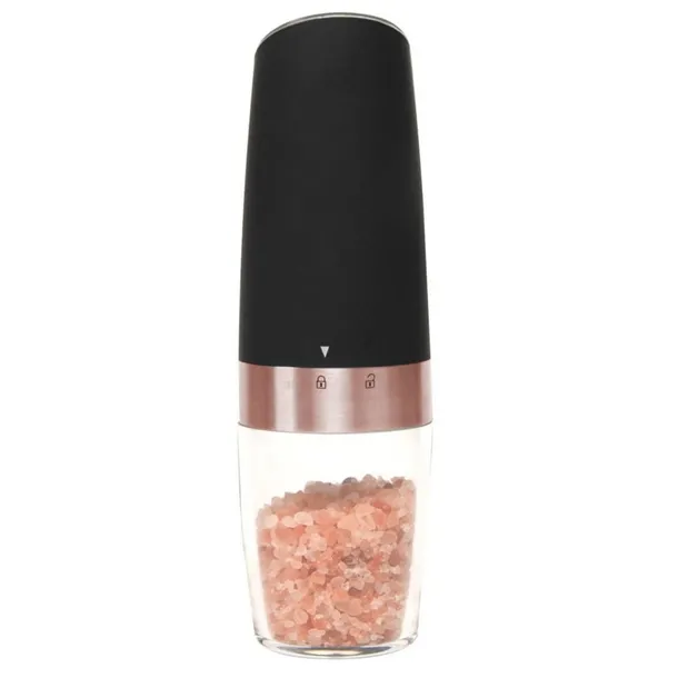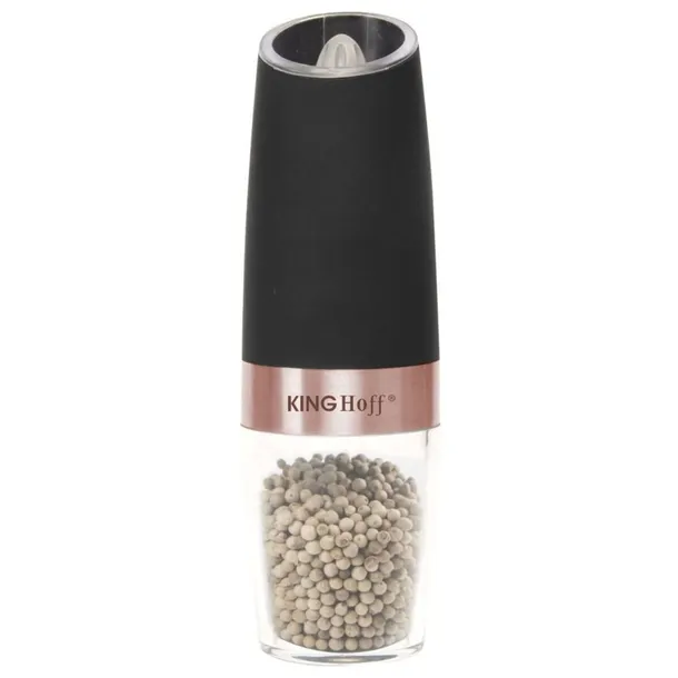 Młynek elektryczny grawitacyjny do soli lub pieprzu firmy KINGHOFF. Bardzo łatwe w użyciu! Wystarczy przekręcić młynek do góry nogami i automatycznie zacznie pracę, odchylić i przestanie mielić. Wykonany z antypoślizgowego tworzywa sztucznego w matowym kolorze czarnym. Obudowa z okienkiem wskazującym poziom zawartości ziaren. Wydajny silnik który bez trudu radzi siebie z każdym rodzajem pieprzu lub soli. Odporny na korozję ceramiczny mechanizm do ścierania z regulacją grubości mielenia. Wyposażony w podświetlenie LED który włącza się automatycznie podczas mielenia.Cechy: