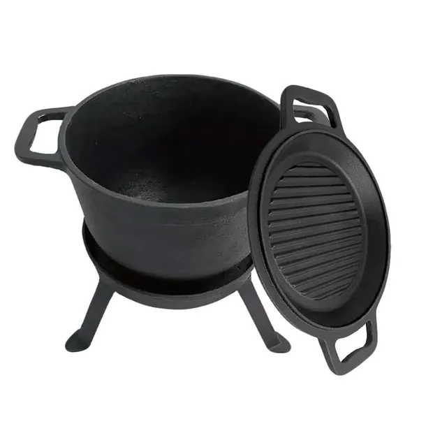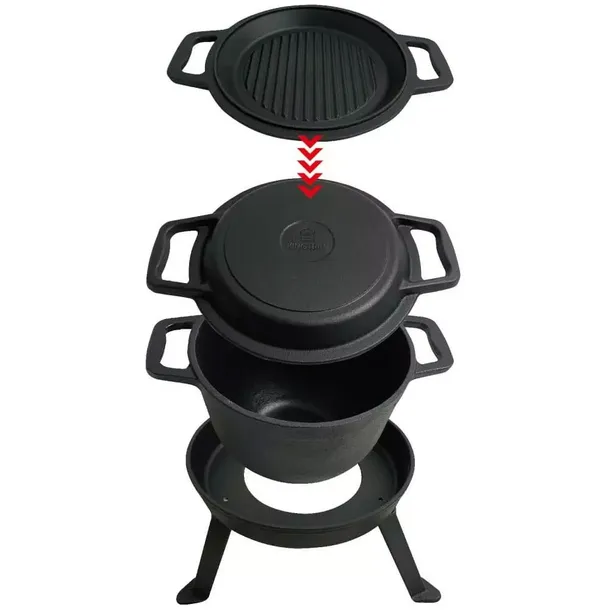 - Można stosować w piekarniku, na kuchenkach i na ognisku,- W zestawie pokrywka z funkcją patelni grillowej, podstawa z dokręcanymi nóżkami, żeliwny kociołek,- Łatwy w utrzymaniu w czystości.