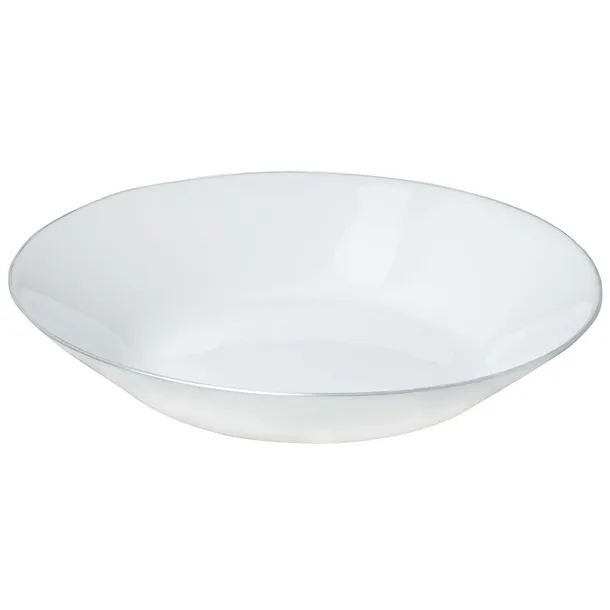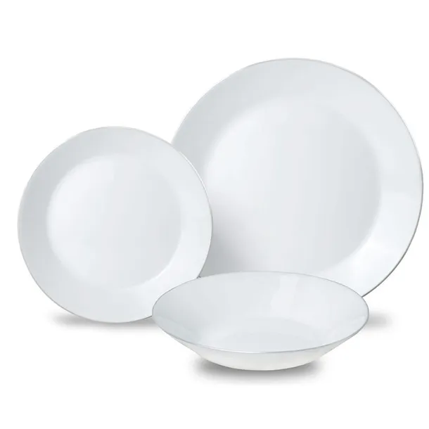 Wykonany z wysokiej jakości ceramiki w ponadczasowym, białym kolorze ze srebrnym rantem.