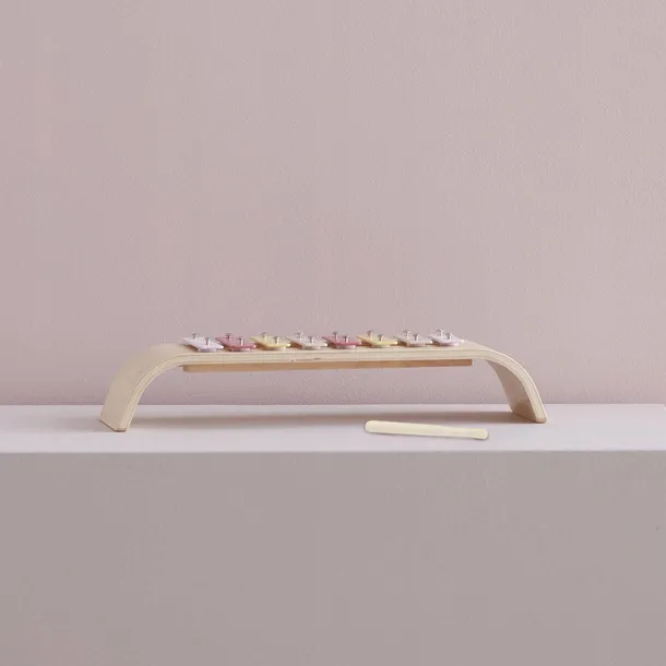 Zabawkowy ksylofon ze sklejki bejcowanej naturalnie z kolorowymi płytkami.