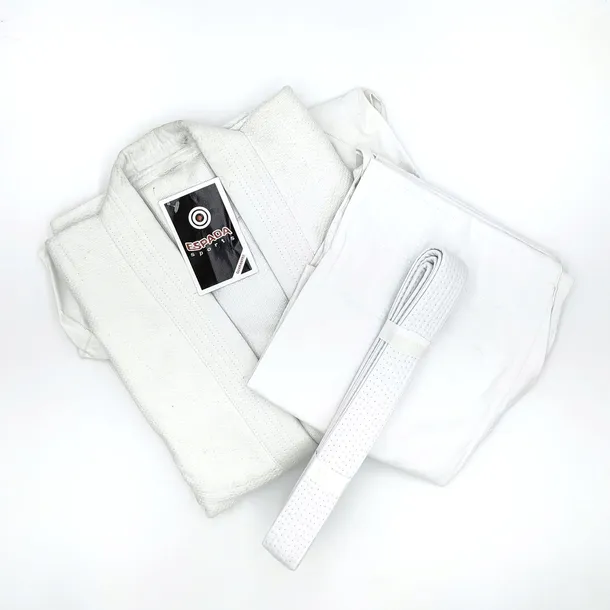 Kimono do Judo marki Espada wykonane z bawełny. Uszyta zgodnie z standardowym wzorem. Spodnie gładkie, wiązane na troczki. Jest to znakomite kimono dla zawodników w każdymi wieku. Zestaw zawiera biały pas.