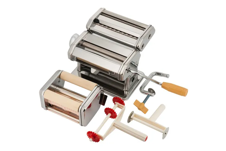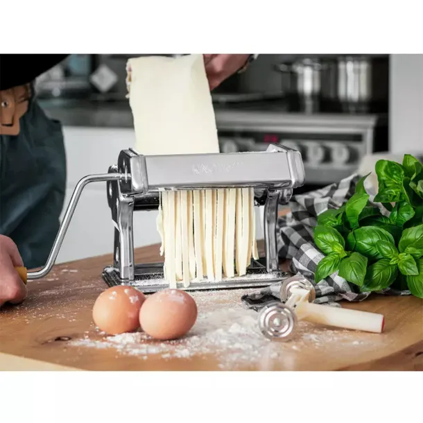 Przyrządź sam własny i świeży makaron spaghetti i wiele innych.Regulowane wałki stalowe do wyrobu ciasta na makaron.Dwie szerokości cięcia - 2 mm / 6 mm.Ustawienia do wyboru różnych grubości ciasta.Podstawka z klamrą mocującą, wraz z instrukcją obsługi.Kompletny zestaw akcesoriów do wyrobu makaronu w różnych kształtach i wzorach.Maszynka do makaronu wykorzystywana jest do przygotowywania potraw w tradycyjnej kuchni włoskiej.Świeży makaron dodany do potraw daje wyjątkowy smak i aromat którego nie uzyskasz z tradycyjnych makaronów suszonych.Wyrabianie makaronu z użyciem maszynki nigdy nie było łatwiejsze.