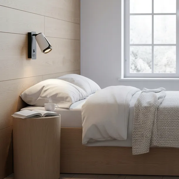Elegancki kinkiet z gniazdem GU10 i podwójnym portem USB to funkcjonalna oprawa idealna do sypialni, gabinetów, pokoi hotelowych oraz przestrzeni do czytania. Połączenie białęgo matu z czarnym akcentem nadaje lampie charakter premium, a pełna regulacja kierunku świecenia zapewnia maksymalny komfort użytkowania.