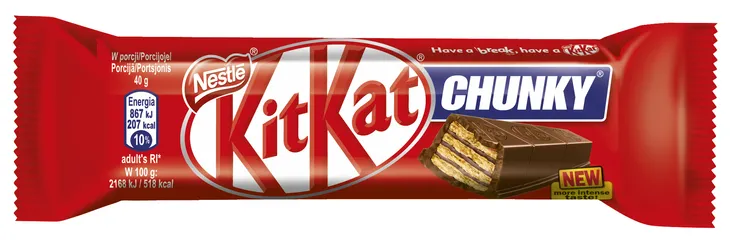 Odkryj wyjątkowy smak paluszka waflowego Nestlé KitKat Chunky. Ten chrupiący wafelek pokryty grubą warstwą mlecznej czekolady to doskonała przekąska na każdą porę dnia, która dostarczy Ci energii i przyjemności.