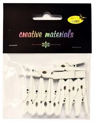 Klamerki drewniane wielkości 35x10 mm, pokryte wodoodporną farbą w kolorze białym. Opakowanie zawiera 10 klamerek. Pakowane w opakowanie z eurozawieszką.