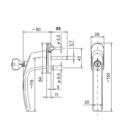 - Klamka z kluczykiem aluminiowa 35 mm 9016