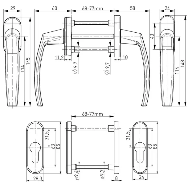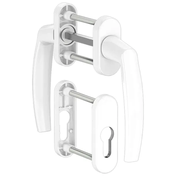 - w komplecie: klamka wewnętrzna, klamka zewnętrzna, trzpień, komplet rozet oraz śruby montażowe