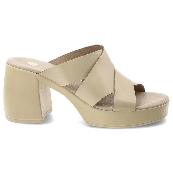 Klapki damskie Armodo, cholewka ze skóry naturalnej licowej z szerokimi krzyżującymi się paskami na wysokim obcasie, beżowe, 40524