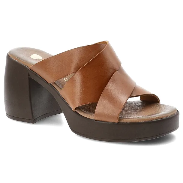 Klapki damskie Armodo, cholewka ze skóry naturalnej z szerokimi krzyżującymi się paskami wsuwany fason odkryty przód masywna platforma i stabilny obcas, brązowe, 40524