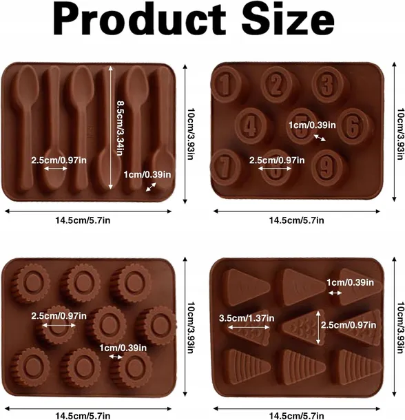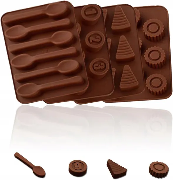 - Małe foremki do czekolady: zestaw zawiera 4 formy do pralinek o różnych kształtach, takich jak łyżki, trójkąty, cyfry i kwiaty.